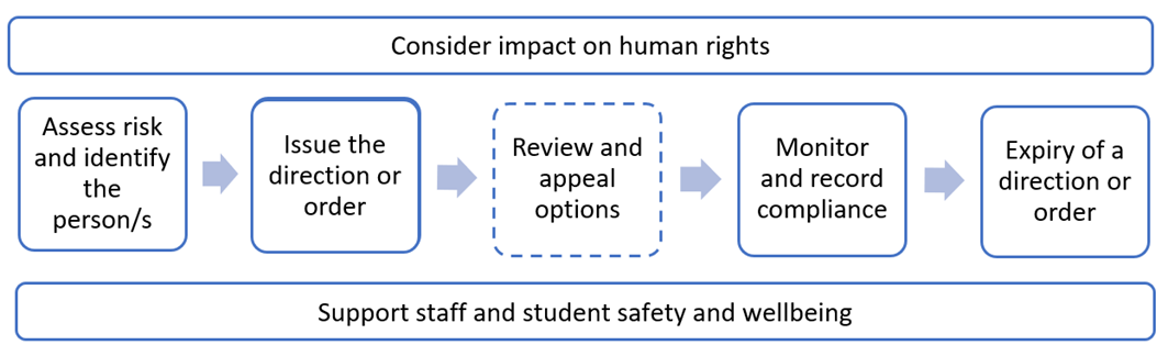 The principal or Director-General (or delegate) can give different types of oral and/or written directions and seek orders, depending on the circumstances and type of conduct being exhibited. These directions or orders apply for different durations and either regulate a person's conduct or movement, or prohibit entry to school premises. Before giving a direction or seeking an order, the principal or Director-General (or delegate) must consider various factors and be reasonably satisfied it is necessary and compatible with human rights.